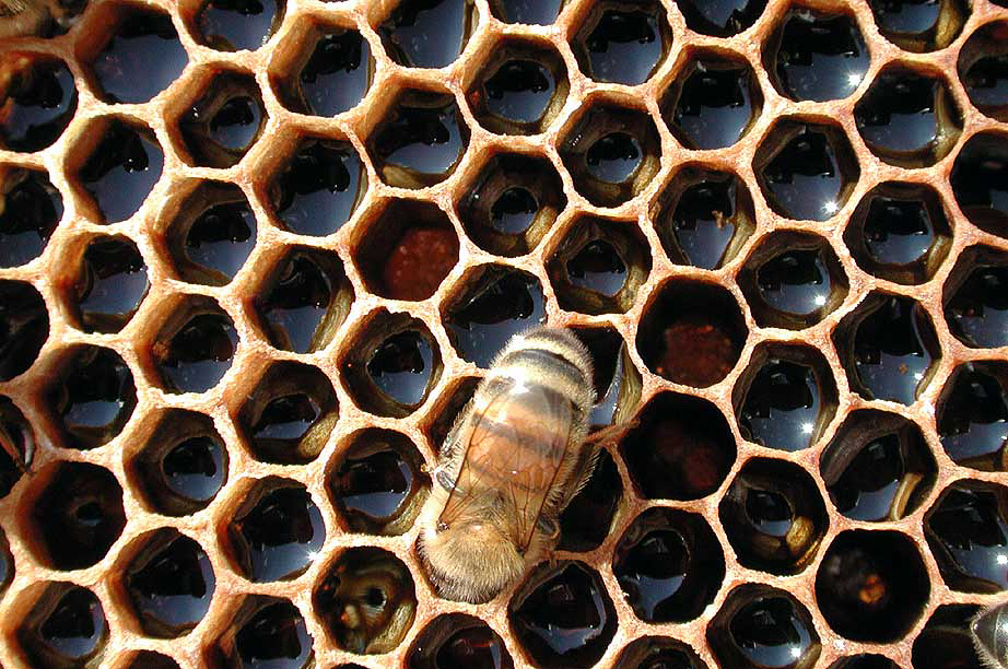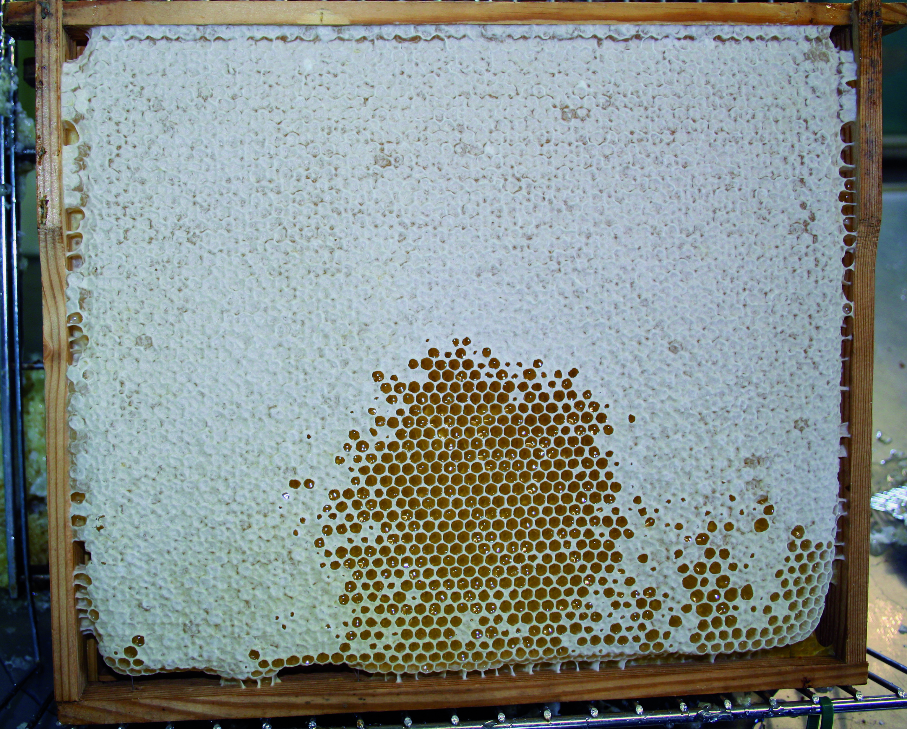 Den færdige honning bliver nu gemt i cellerne på vokstavlerne. Nu mangler bierne kun at lukke cellen med honning. Det gør de ved at lave et fint, hvidt vokslåg ovenpå honningen.
