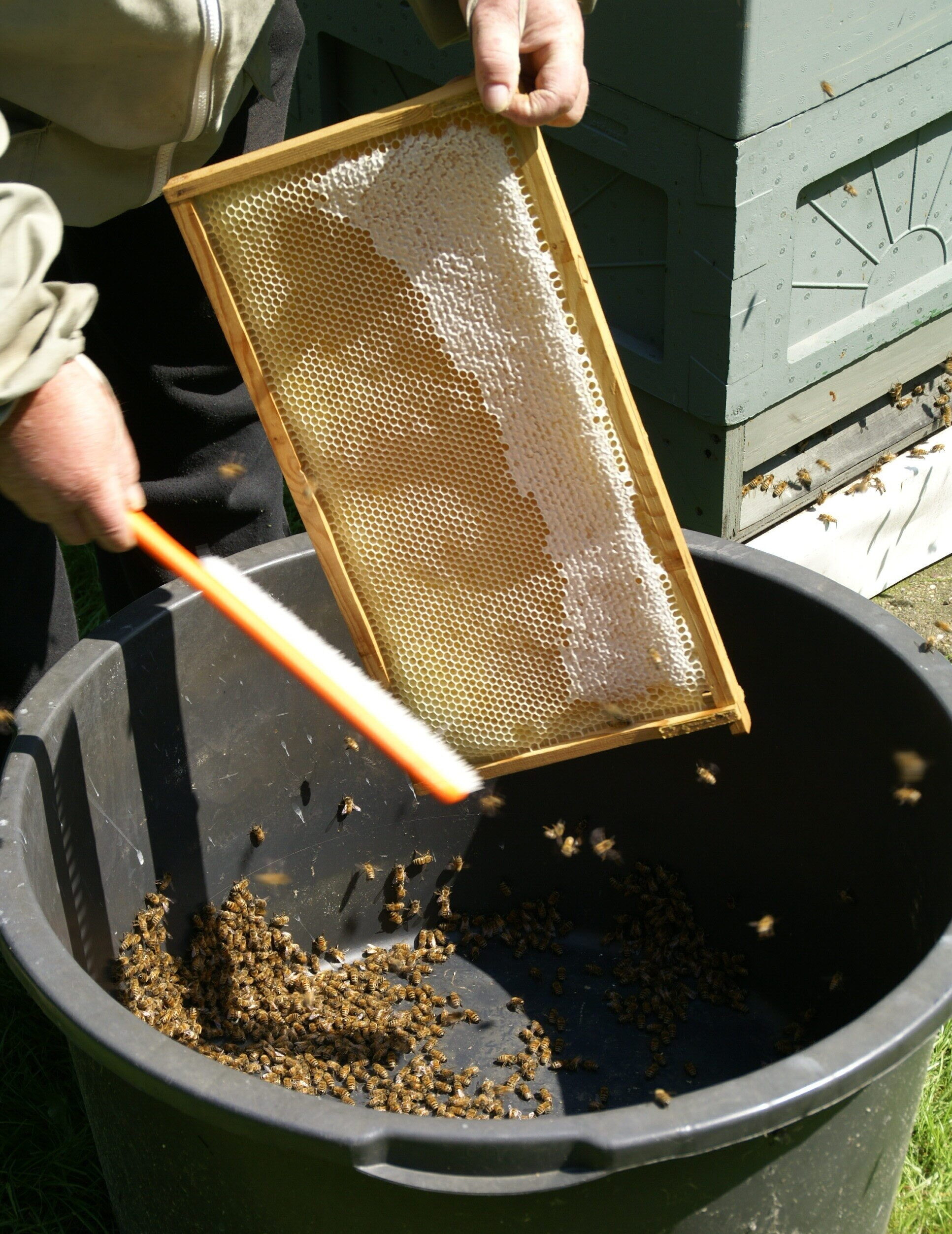 Bierne skal børstes af honningtavlen inden biavleren kan tage honningen med hjem. Bierne som bliver børstet af, flyver hurtigt hjem til deres familie. Foto Klaus Langschwager.