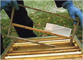 A completely new form for vaporizer on the Danish marked is the apidea vaporizer. The principal is similar to that of the Kråmer board . The vaporizer consists of a tray in which a “dishcloth” is placed , which is able to absorb the formic acid. The tray is encloses by two surfaces, in a hollow system. The opening is created, and regulated, by moving the surfaces away from one another. Evaporation is only created from one side. The vaporizer is best filled using a squirt bottle out in the apiary. The vaporizer should be raised, just like the Kråmer boards, about 2 cm. over the frames. According to the German manual., it is operated with 60, 70 and 85% formic acid solutions. Testing with 85% soln. in Denmark has shown good results, but testing with a 60% soln. has shown less promising results than the Kråmer board method.