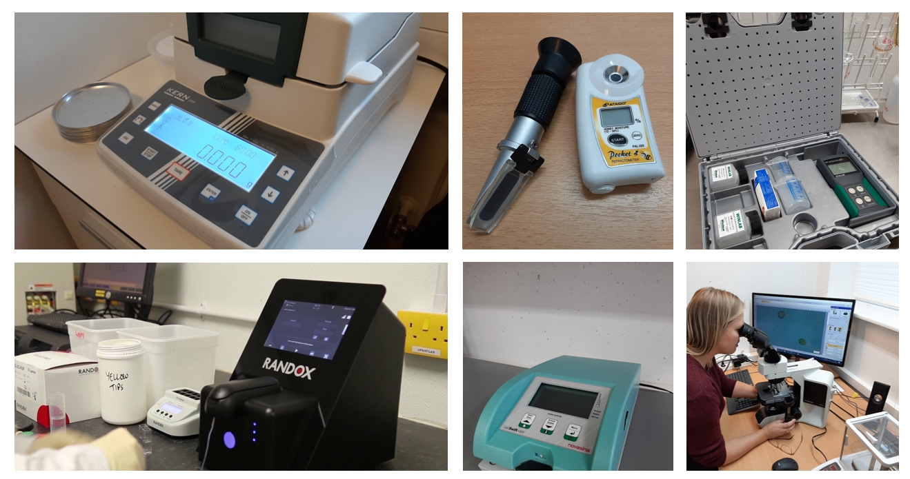 Honningen analyseres for vandindhold, sukker (glukose og fruktose), diastase, HMF, ledningsevne og pH.